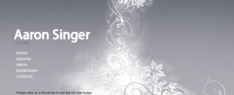 Inside you'll find all sorts of things like a resume and demo reel. You'll also find a breakdown sheet for that demo reel. Just click on a thumbnail for the full size image. Then finally, there is a contact page. So go ahead and contact me.